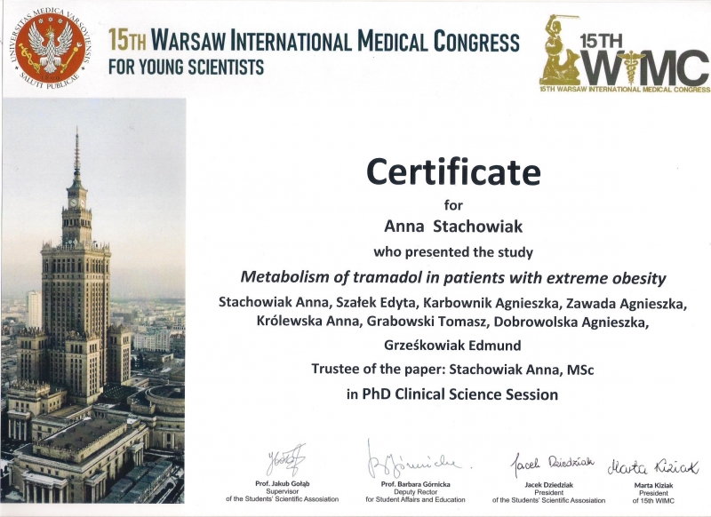 Doktorantka mgr farm. Anna Stachowiak uczestniczyła w międzynarodowej konferencji 15th Warsaw International Medical Congress for Young Scientists 9-12.05.2019. Podczas wystąpienia ustnego doktorantka zaprezentowała wyniki swojej pracy w formie prezentacji ustnej pt. "Metabolism of tramadol in patients with extreme obesity".
