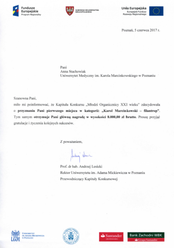 Z radością informujemy, że Anna Stachowiak - studentka Koła Naukowego Farmacji Klinicznej - zajęła I miejsce w konkursie "Młodzi Organicznicy XXI wieku".