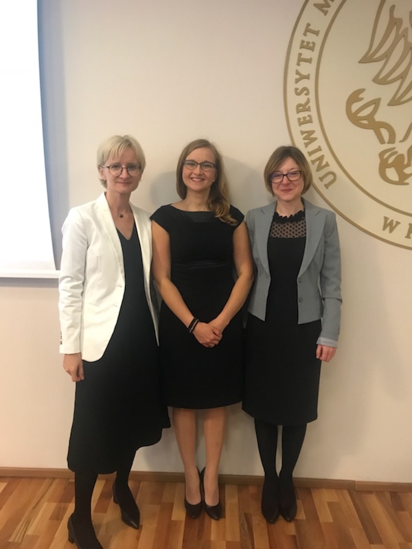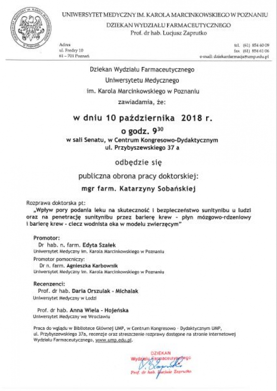 Dnia 10 października 2018 roku odbyła się publiczna obrona rozprawy doktorskiej mgr farm. Katarzyny Sobańskiej, pracownika Katedry Farmacji Klinicznej i Biofarmacji. Rozprawa doktorska Wpływ pory podania leku na skuteczność i bezpieczeństwo sunitynibu u ludzi oraz na penetrację sunitynibu przez barierę krew-płyn mózgowo-rdzeniowy i barierę krew-ciecz wodnista oka w modelu zwierzęcym została wykonana w Katedrze i Zakładzie Farmacji Klinicznej i Biofarmacji pod kierownictwem pani dr hab. n. farm. Edyty Szałek oraz przy udziale promotora pomocnicznego pani dr n. farm. Agnieszki Karbownik.