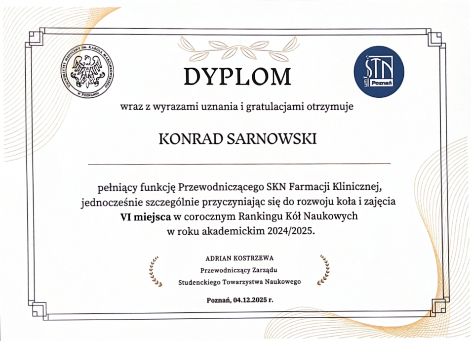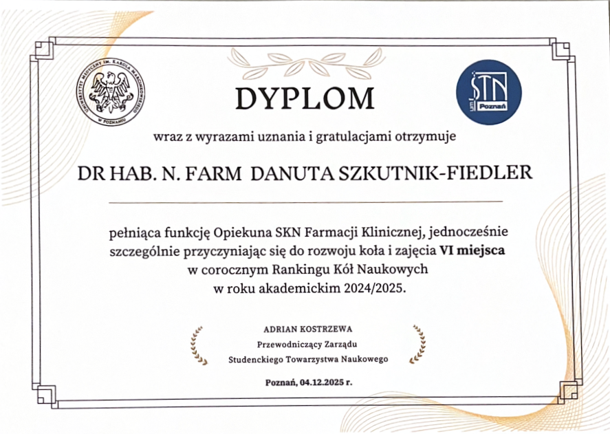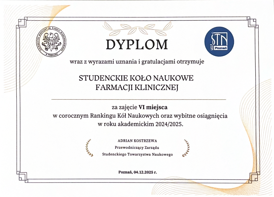 Studenckie Koło Naukowe Farmacji Klinicznej zajęło VI miejsce w tegorocznym Rankingu Kół Naukowych UMP spośród 137 kół funkcjonujących w strukturach naszej uczelni.