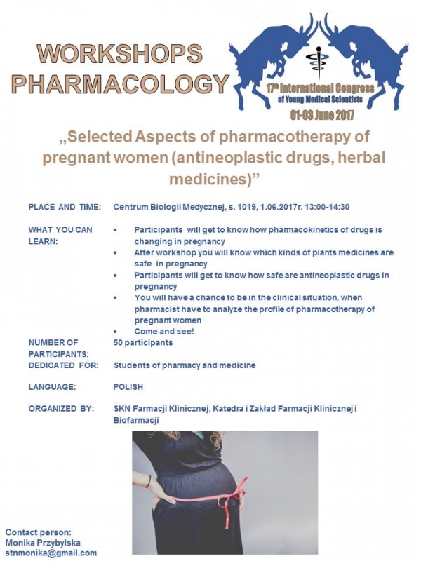 Zapraszamy studentów farmacji i medycyny do udziału w warsztatach organizowanych przez SKN Farmacji Klinicznej w ramach "17th International Congress of Young Medical Scientists" 1.06.2017 godz 13.00-14.30 (sala 1019 CBM). Będzie to okazja do zapoznania się z tematyką dotyczącą farmakoterapii kobiet w ciąży i analizy przypadków klinicznych. Zachęcamy do udziału!